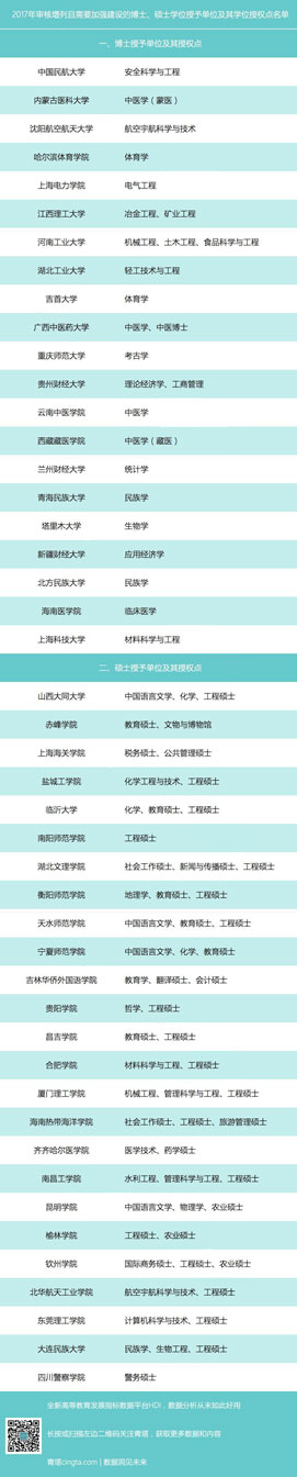除上述高校外,還有2017年審核增列且需要加強建設的21所博士學位授予單位、25所碩士學位授予單位獲批。2017年新增博士學位授予單位審核結果如下: