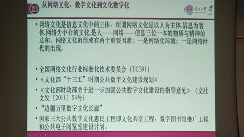 主講嘉賓柯平教授分享了題為“數(shù)字中國(guó)與文化強(qiáng)國(guó)背景下的文化數(shù)字化國(guó)家戰(zhàn)略:學(xué)科使命與行業(yè)發(fā)展思考”的學(xué)術(shù)報(bào)告,分析了數(shù)字中國(guó)、文化強(qiáng)國(guó)以及《關(guān)于推進(jìn)實(shí)施國(guó)家文化數(shù)字化戰(zhàn)略的意見》發(fā)布的背景下,公共文化服務(wù)和文化產(chǎn)業(yè)迎來的新機(jī)遇。
