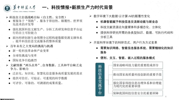 曾建勛教授分享了“科技情報新質生產(chǎn)力之思考”,闡述科技情報+新質生產(chǎn)力的內(nèi)涵與時代背景、科技情報與新質生產(chǎn)力間相互作用機理,從新質化信息資源、數(shù)智化組織方法、新質化服務平臺、數(shù)智化分析工具等方面舉例說明如何推進科技情報新質生產(chǎn)力,提出了科技情報新質生產(chǎn)力的發(fā)展策略。