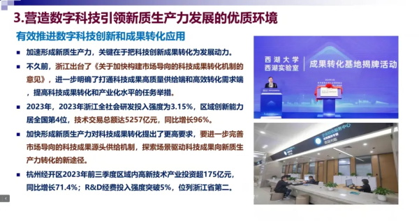 浙江省信息化發(fā)展研究院首席專家陳疇鏞教授首先作了題為“數(shù)字科技引領(lǐng)新質(zhì)生產(chǎn)力發(fā)展”的報(bào)告。他深入探討了數(shù)字科技對(duì)勞動(dòng)力、生產(chǎn)工具和勞動(dòng)對(duì)象的深遠(yuǎn)影響,指出數(shù)字科技創(chuàng)新是加快形成新質(zhì)生產(chǎn)力的核心動(dòng)力,并細(xì)數(shù)了浙江以數(shù)字科技促新興產(chǎn)業(yè)提質(zhì)擴(kuò)量、未來產(chǎn)業(yè)培育成長、傳統(tǒng)產(chǎn)業(yè)提能升級(jí)等的豐富實(shí)踐和為此優(yōu)化營商環(huán)境的努力。