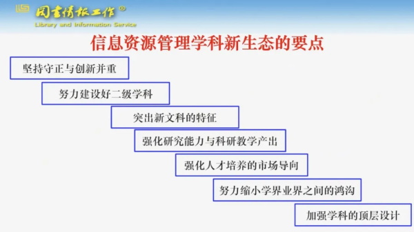 隨后,中國科學(xué)院文獻(xiàn)情報(bào)中心學(xué)術(shù)委員會(huì)主任初景利教授從新質(zhì)生產(chǎn)力視角審視信息資源管理學(xué)科建設(shè),圍繞“面向新質(zhì)生產(chǎn)力構(gòu)建信息資源管理學(xué)科發(fā)展新生態(tài)”的主題,闡述新質(zhì)生產(chǎn)力與信息資源管理學(xué)科的關(guān)系,列舉信息管理學(xué)科傳統(tǒng)生態(tài)的種種問題,提出了構(gòu)建信息管理學(xué)科新生態(tài)的要點(diǎn)。