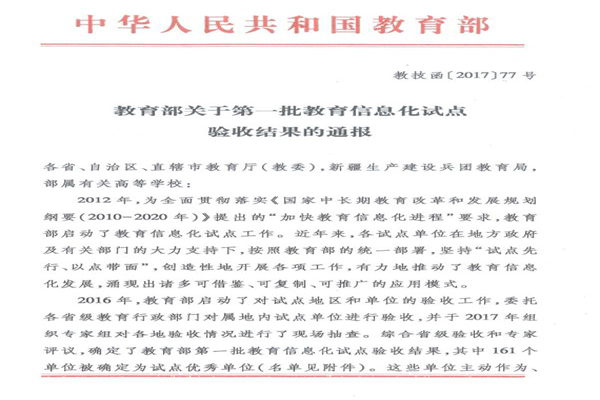 根據(jù)《教育部關(guān)于第一批教育信息化試點(diǎn)驗(yàn)收結(jié)果的通報(bào)》(教技函[2017]77號)文件,我院被確定為試點(diǎn)優(yōu)秀單位,這也是甘肅省高職院校唯一獲此殊榮的單位。文件中指出:獲評優(yōu)秀單位主動作為、積極投入、創(chuàng)新機(jī)制、扎實(shí)實(shí)踐、成效明顯,很多先進(jìn)經(jīng)驗(yàn)和典型模式通過現(xiàn)場會、培訓(xùn)班、宣傳冊等平臺,被全國各地學(xué)習(xí)借鑒,輻射效應(yīng)凸顯。