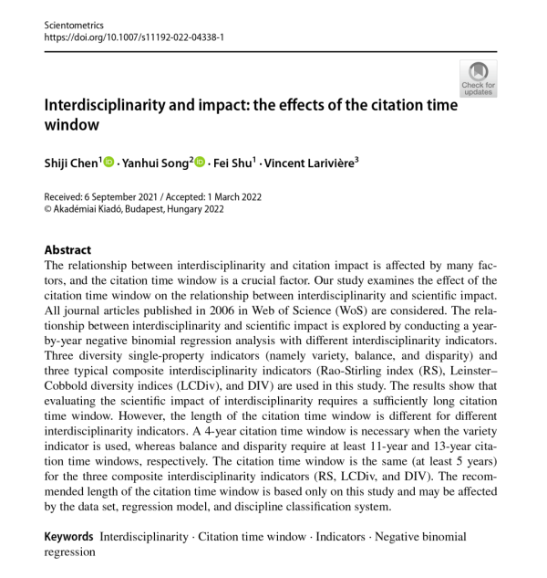 近日,我院陳仕吉教授、宋艷輝教授、舒非教授與加拿大蒙特利爾大學(xué)信息學(xué)教授Vincent Larivière合作論文《Interdisciplinarity and impact: the effects of the citation time window》發(fā)表于國際計(jì)量學(xué)頂級期刊《Scientometrics》(SSCI,影響因子3.238)。