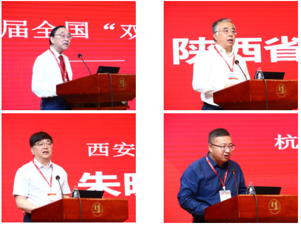 左上:邱均平資深教授主持開(kāi)幕式;右上:陜西省學(xué)位委員會(huì)秘書(shū)長(zhǎng)袁寧致辭;左下:西安建筑科技大學(xué)黨委書(shū)記朱曉渭致辭;右下:杭州電子科技大學(xué)副校長(zhǎng)李文鈞致辭