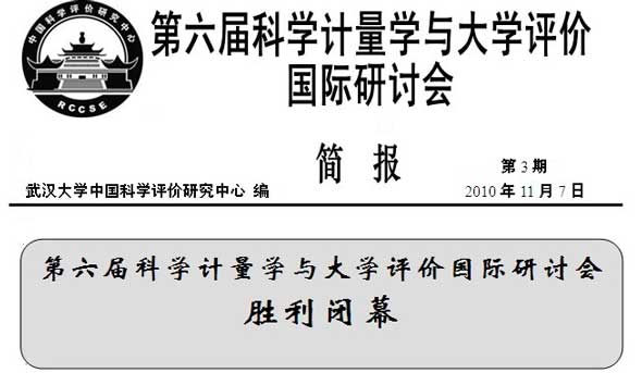 ![]() 第六屆科學(xué)計量學(xué)與大學(xué)評價國際研討會,經(jīng)過全體與會代表的共同努力和大會工作人員的辛勤勞動,已經(jīng)圓滿完成了各項議程,于2010年11月6日勝利閉幕了。大會組委會向所有關(guān)心支持我們工作的各級領(lǐng)導(dǎo)表示崇高的敬意!向全體與會專家和代表,表示衷心的感謝!向為大會付出辛勤勞動的會議工作人員致以誠摯的謝意!