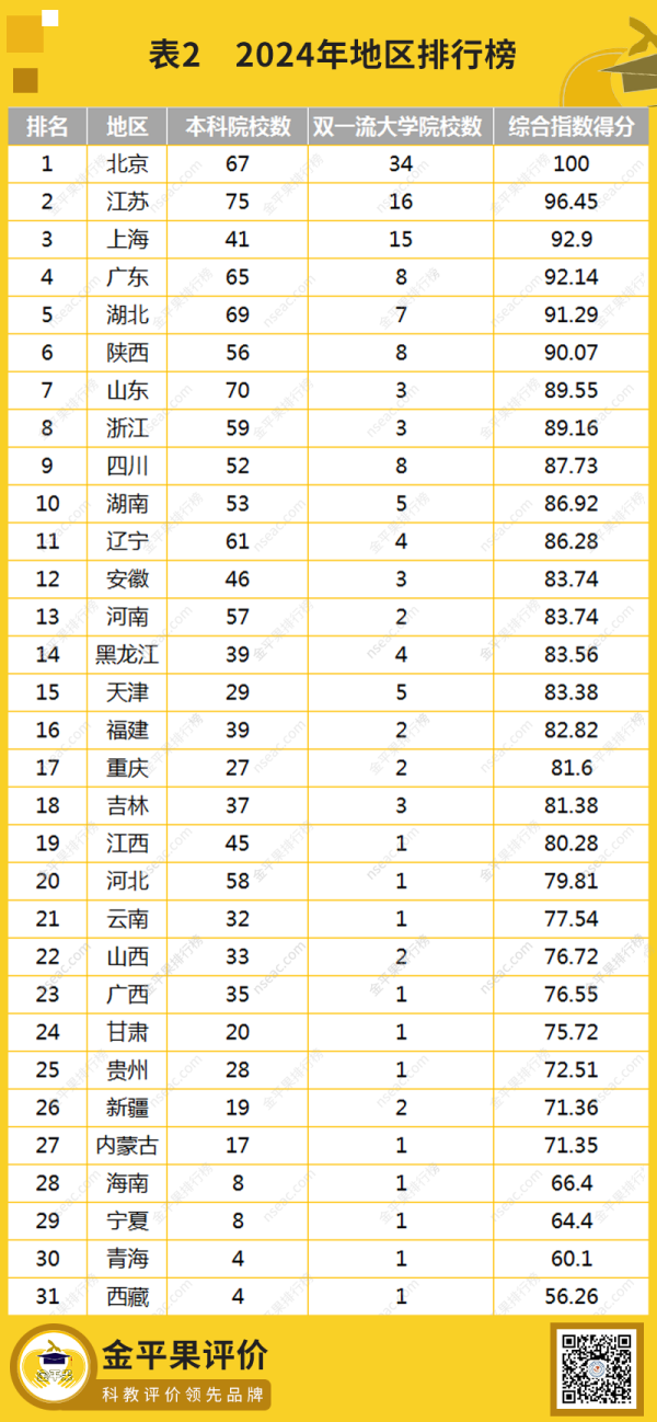 2024年4月30日,金平果正式發(fā)布“2024年中國大學(xué)排名”。北京大學(xué)、清華大學(xué)、浙江大學(xué)蟬聯(lián)主榜前三位。中央財經(jīng)大學(xué)、中央民族大學(xué)、中國農(nóng)業(yè)大學(xué)、北京體育大學(xué)、北京協(xié)和醫(yī)學(xué)院和中央美術(shù)學(xué)院分別位居財經(jīng)類、民族類、農(nóng)林類、體育類、醫(yī)藥類和藝術(shù)類大學(xué)榜首。