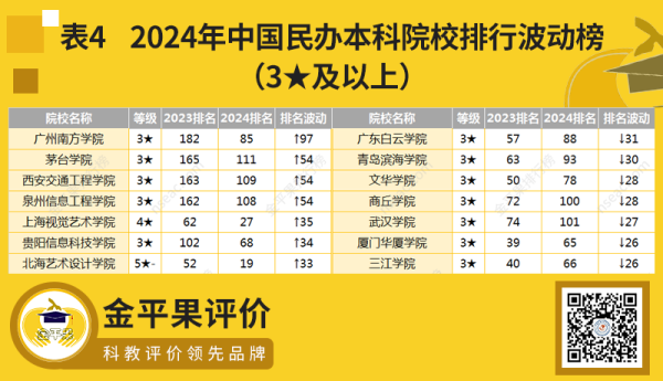 表4是2024年中國民辦本科院校排行波動榜。從表中可以得知,排名波動較大的大多是3★及以下的學(xué)校(此處低于3★的未展示),但也有部分等級較高的藝術(shù)類學(xué)校如上海視覺藝術(shù)學(xué)院、北海藝術(shù)設(shè)計學(xué)院等在今年大幅提升了自己的整體實(shí)力。目前,民辦本科院校群體的整體實(shí)力還比較弱,且排名波動較大,在師資力量、專業(yè)優(yōu)勢、教學(xué)資源、科研水平等方面較之公辦本科院校仍有一定差距。需要指出的是,一些優(yōu)秀的民辦院校也在不斷提升自身實(shí)力,與公辦院校不相上下。