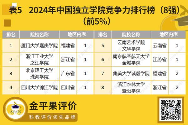 本次大學(xué)評價也包含對獨(dú)立學(xué)院的評價,因部分獨(dú)立學(xué)院正在經(jīng)歷院校轉(zhuǎn)制,故此次評價的獨(dú)立學(xué)院數(shù)量較少,共156所,其中獨(dú)立學(xué)院的8強(qiáng)(前5%)如表5所示。
