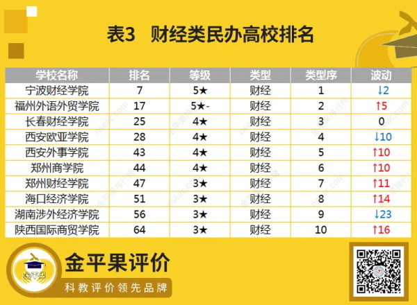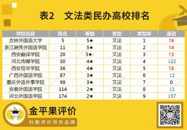 南昌理工學院、江西科技學院、西京學院、北京城市學院穩(wěn)列前四名。十強中,吉林外國語大學相較去年上升6名,位列第5;廣東科技學院上升4名,位列第9;泰山科技學院上升10名,位列第10。前五十強中,綜合類院校共有72所,理工類院校共有84所,財經(jīng)類院校共有37所,藝術類院校11所,文法類院校9所。