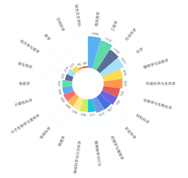 北大榮獲學(xué)科“大滿貫”;清華大學(xué)的計(jì)算機(jī)科學(xué)、工程學(xué)排名全球第1位;中國科學(xué)院大學(xué)的化學(xué)和材料科學(xué)獲得全球第1位;北大、浙大、上海交大、中山大學(xué)、清華、復(fù)旦6所大學(xué)都有20個(gè)或以上學(xué)科進(jìn)入ESI排名;15個(gè)學(xué)科進(jìn)入的達(dá)20所大學(xué)。
