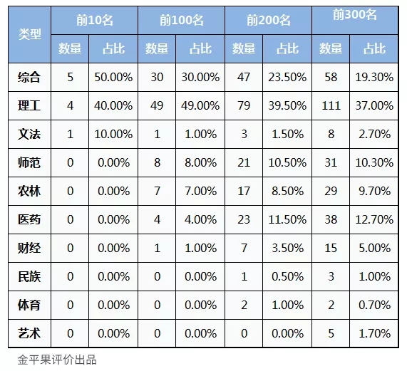 (2)300強(qiáng)類(lèi)型比,不同高校類(lèi)型的排名分布差距明顯