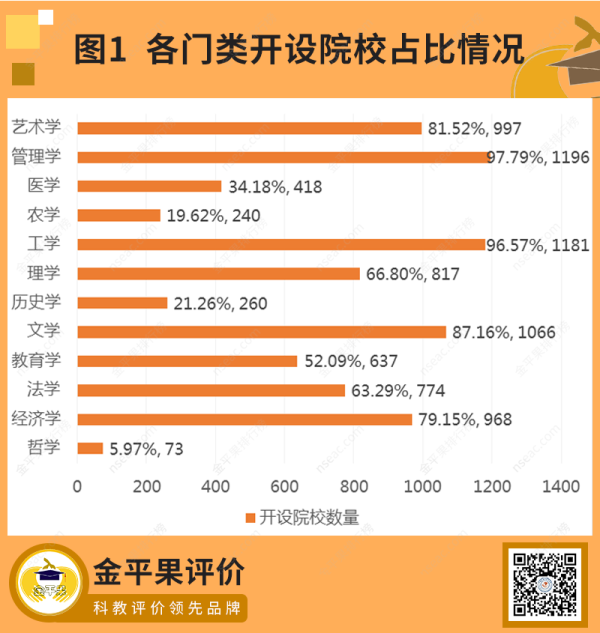 表1統(tǒng)計了我國1223所院校開設(shè)各個學(xué)科門類的情況,其中管理學(xué)開設(shè)院校數(shù)量最多,多達(dá)1196所;哲學(xué)開設(shè)院校數(shù)量最少,只有73所,占比僅為5.97%;其次是農(nóng)學(xué)。具體占比情況,如圖1所示。