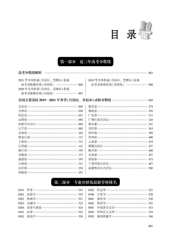 本書包括四部分內(nèi)容。一是近三年高考分數(shù)線。本書在對控制分數(shù)線、一本線、二本線等各種高考分數(shù)線的含義進行解釋的基礎(chǔ)上,提供了全國31個省(自治區(qū)、直轄市)2019—2021年各批次錄取分數(shù)線和全國主要高校2019—2021年各省(自治區(qū)、直轄市)的錄取分數(shù)線。二是專業(yè)介紹及學(xué)科排名。詳細介紹了92個招生專業(yè)類的內(nèi)容,并給出了12個學(xué)科門類的高校排名情況。三是高考志愿填報解疑和技巧。以問答的形式,對高考學(xué)生及其家長關(guān)注的問題進行深入解析,使全書更具指導(dǎo)意義。四是重要的附錄資料。收錄部分參考價值較高的資料作為附錄,特別是由中國科教評價研究院(杭電)等單位聯(lián)合研制的2022年中國大學(xué)及學(xué)科專業(yè)競爭力排行榜,對考生了解和選擇高校、專業(yè)大有裨益。本書主要針對高考學(xué)生及其家長的需求,為高考學(xué)生填報志愿提供有力的參考依據(jù)與報考指導(dǎo)。本書還可以成為中學(xué)領(lǐng)導(dǎo)及教師、高校領(lǐng)導(dǎo)及教師、招生人員了解高校招生情況的有力幫手,實時解答高考學(xué)生報考疑難。同時,本書還能為教育研究院/系/所和培訓(xùn)機構(gòu)、廣大教育工作者及社會各界人士提供高考數(shù)據(jù)和參考。
