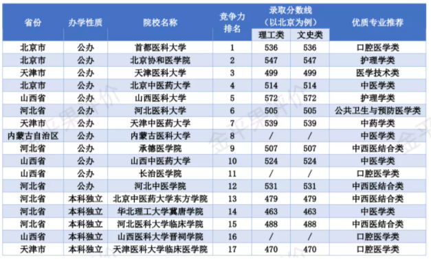 臨近高考志愿填報(bào)關(guān)鍵期,中國(guó)科教評(píng)價(jià)研究院將陸續(xù)推出《大學(xué)排名與高考志愿指南》的院校篇和專(zhuān)業(yè)篇。 ![]() 其中院校篇分為華東、華北、華中、華南、東北、西南、西北七個(gè)篇章,囊括了全國(guó)31個(gè)省市自治區(qū),共1230所高校的競(jìng)爭(zhēng)力排名情況、去年錄取分?jǐn)?shù)線以及優(yōu)質(zhì)專(zhuān)業(yè)推薦等重要信息。每個(gè)篇章依據(jù)學(xué)校類(lèi)型依次分為綜合類(lèi)、財(cái)經(jīng)類(lèi)、師范類(lèi)、理工類(lèi)、醫(yī)藥類(lèi)和農(nóng)林類(lèi)。因獨(dú)立學(xué)院轉(zhuǎn)設(shè)問(wèn)題,部分獨(dú)立學(xué)院的辦學(xué)性質(zhì)和院校名稱(chēng)仍沿用原名稱(chēng)。專(zhuān)業(yè)篇依據(jù)麥可思研究院發(fā)布的《2020年中國(guó)大學(xué)生就業(yè)報(bào)告》選出就業(yè)薪酬排名前十的熱門(mén)專(zhuān)業(yè)類(lèi)做一個(gè)院校大盤(pán)點(diǎn),主要涉及計(jì)算機(jī)類(lèi)、電子信息類(lèi)、自動(dòng)化類(lèi)、儀器類(lèi)、電子商務(wù)類(lèi)、金融學(xué)類(lèi)、交通運(yùn)輸類(lèi)、管理科學(xué)與工程類(lèi)、數(shù)學(xué)類(lèi)、財(cái)政學(xué)類(lèi)。相關(guān)內(nèi)容將會(huì)陸續(xù)推出,敬請(qǐng)期待! 專(zhuān)家建議: 志愿填報(bào)是人生的一個(gè)重要選擇,涉及了院校選擇(發(fā)展城市)、專(zhuān)業(yè)選擇(競(jìng)爭(zhēng)跑道)等。總體上建議考生應(yīng)結(jié)合自身的未來(lái)發(fā)展規(guī)劃、性格天賦、興趣導(dǎo)向來(lái)報(bào)考。但對(duì)不同分?jǐn)?shù)段考生,我們也提供了以下一些建議: 1、高分段(一般是一本線20分以上)學(xué)生建議以院校優(yōu)先考慮,爭(zhēng)取進(jìn)入實(shí)力較強(qiáng)的院校,專(zhuān)業(yè)如不滿(mǎn)意還可以爭(zhēng)取轉(zhuǎn)專(zhuān)業(yè)的機(jī)會(huì)。 2、中低分段(一般是本科線到一本線)學(xué)生建議專(zhuān)業(yè)優(yōu)先考慮,進(jìn)入一個(gè)自己有優(yōu)勢(shì),與自己未來(lái)職業(yè)規(guī)劃更匹配的專(zhuān)業(yè),在擅長(zhǎng)的領(lǐng)域?qū)崿F(xiàn)彎道超車(chē)。 3、無(wú)論采用哪種選擇策略,都要注意設(shè)置志愿方案的沖、穩(wěn)、保梯度,控制風(fēng)險(xiǎn)。 4、獨(dú)立學(xué)院轉(zhuǎn)公的,分?jǐn)?shù)預(yù)計(jì)會(huì)上升;轉(zhuǎn)民辦的,分?jǐn)?shù)預(yù)計(jì)會(huì)有所下降;轉(zhuǎn)設(shè)方案未定的,可能會(huì)出現(xiàn)分?jǐn)?shù)波動(dòng),有可能出現(xiàn)撿漏的機(jī)會(huì)。 華北地區(qū)囊括了整個(gè)京津翼地區(qū)和山西省及部分內(nèi)蒙古自治區(qū),是我國(guó)高等教育重鎮(zhèn)。其中,北京市是華北地區(qū)高等教育力量的集中地,共有64所本科高校,清華、北大等知名高校代表我國(guó)一流大學(xué)的建設(shè)水平。 華北地區(qū)以北京地區(qū)的錄取分?jǐn)?shù)線為例,分為理工類(lèi)和文史類(lèi),其醫(yī)藥類(lèi)院校共17所。綜合實(shí)力競(jìng)爭(zhēng)力排名第一的高校是首都醫(yī)科大學(xué),錄取分?jǐn)?shù)線是536分,其優(yōu)質(zhì)專(zhuān)業(yè)推薦主要是口腔醫(yī)學(xué)類(lèi)。排名第二的是北京協(xié)和醫(yī)學(xué)院,錄取分?jǐn)?shù)線是547分,其推薦專(zhuān)業(yè)是護(hù)理學(xué)類(lèi)。 報(bào)考建議:不同分?jǐn)?shù)段的考生要綜合考慮城市+院校+專(zhuān)業(yè)組合的優(yōu)先順序,找出最優(yōu)解。致力于報(bào)考醫(yī)學(xué)的考生建議以自己感興趣的專(zhuān)業(yè)為優(yōu)先考慮因素。 華北地區(qū)醫(yī)藥類(lèi)院校排名情況 ![]()