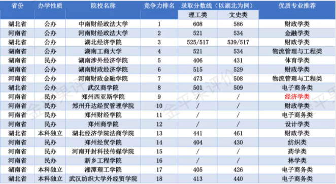 臨近高考志愿填報關鍵期,中國科教評價研究院將陸續(xù)推出《大學排名與高考志愿指南》的院校篇和專業(yè)篇。 ![]() 其中院校篇分為華東、華北、華中、華南、東北、西南、西北七個篇章,囊括了全國31個省市自治區(qū),共1230所高校的競爭力排名情況、去年錄取分數線以及優(yōu)質專業(yè)推薦等重要信息。每個篇章依據學校類型依次分為綜合類、財經類、師范類、理工類、醫(yī)藥類和農林類。因獨立學院轉設問題,部分獨立學院的辦學性質和院校名稱仍沿用原名稱。專業(yè)篇依據麥可思研究院發(fā)布的《2020年中國大學生就業(yè)報告》選出就業(yè)薪酬排名前十的熱門專業(yè)類做一個院校大盤點,主要涉及計算機類、電子信息類、自動化類、儀器類、電子商務類、金融學類、交通運輸類、管理科學與工程類、數學類、財政學類。相關內容將會陸續(xù)推出,敬請期待! 專家建議: 志愿填報是人生的一個重要選擇,涉及了院校選擇(發(fā)展城市)、專業(yè)選擇(競爭跑道)等。總體上建議考生應結合自身的未來發(fā)展規(guī)劃、性格天賦、興趣導向來報考。但對不同分數段考生,我們也提供了以下一些建議: 1、高分段(一般是一本線20分以上)學生建議以院校優(yōu)先考慮,爭取進入實力較強的院校,專業(yè)如不滿意還可以爭取轉專業(yè)的機會。 2、中低分段(一般是本科線到一本線)學生建議專業(yè)優(yōu)先考慮,進入一個自己有優(yōu)勢,與自己未來職業(yè)規(guī)劃更匹配的專業(yè),在擅長的領域實現彎道超車。 3、無論采用哪種選擇策略,都要注意設置志愿方案的沖、穩(wěn)、保梯度,控制風險。 4、獨立學院轉公的,分數預計會上升;轉民辦的,分數預計會有所下降;轉設方案未定的,可能會出現分數波動,有可能出現撿漏的機會。 華中地區(qū)包含河南省、湖北省和湖南省。其中,湖北省高校有68所,數量上是除江蘇省外,我國第二大高等教育大省。而2021年河南省高考報名人數以125萬的穩(wěn)居第一,超過山東省約45萬人。 華中地區(qū)以湖北省的錄取分數線為例,分為理工類和文史類,其財經類院校共18所。綜合競爭力排名第一的中南財經政法大學錄取分數線分別是608分(理工)和586分(文史),其優(yōu)質推薦專業(yè)是財政學類。綜合競爭力排名第二的河南財經政法大學錄取分數線分別是6521分(理工)和534分(文史),其優(yōu)質推薦專業(yè)是金融學類。具體情況如下表所示。 報考建議:位于500分左右的考生,謹慎選擇報考院校,謹防出現報考扎堆現象,建議擴大報考院校地區(qū)或擴展院校類型。不同分數段的考生要綜合考慮城市+院校+專業(yè)組合的優(yōu)先順序,找出最優(yōu)解。 華中地區(qū)財經類院校排名情況 ![]()