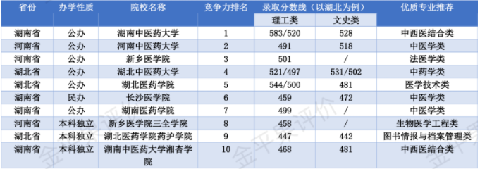 華中地區(qū)以湖北省的錄取分?jǐn)?shù)線為例,分為理工類和文史類,其醫(yī)藥類院校共10所。綜合競爭力排名第一的湖南中醫(yī)藥大學(xué)錄取分?jǐn)?shù)線分別是583/520分(理工)和528分(文史),其優(yōu)質(zhì)推薦專業(yè)是中西醫(yī)結(jié)合類。綜合競爭力排名第二的河南中醫(yī)藥大學(xué),該院校是錄取分?jǐn)?shù)線分別是491分(理工)和518分(文史類),主要推薦專業(yè)是中醫(yī)學(xué)類。具體情況如下表所示。