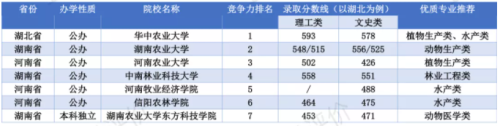 華中地區(qū)以湖北省的錄取分?jǐn)?shù)線為例,分為理工類和文史類,其農(nóng)林類院校共7所。綜合競爭力排名第一的華中農(nóng)業(yè)大學(xué)錄取分?jǐn)?shù)線分別是593分(理工)和578分(文史),其優(yōu)質(zhì)推薦專業(yè)是植物生產(chǎn)類和水產(chǎn)類。綜合競爭力排名第二的湖南農(nóng)業(yè)大學(xué),該院校錄取分?jǐn)?shù)線分別是548/515分(理工)和556/525分(文史類),主要推薦專業(yè)是動物生產(chǎn)類。具體情況如下表所示。