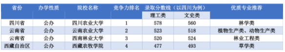 西南地區(qū)以四川省的錄取分?jǐn)?shù)線為例,分為理工類和文史類,其農(nóng)林類院校共4所。綜合競爭力排名第一的四川農(nóng)業(yè)大學(xué)錄取分?jǐn)?shù)線分別是578分(理工)和560分(文史),其優(yōu)質(zhì)推薦專業(yè)是林學(xué)類。綜合競爭力排名第二的是云南農(nóng)業(yè)大學(xué),該院校錄取分?jǐn)?shù)線分別是523分(理工)和518分(文史),主要推薦專業(yè)是植物生產(chǎn)類和動物生產(chǎn)類。具體情況如下表所示。