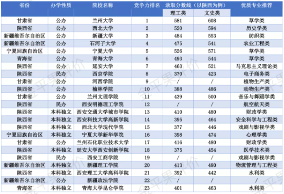 西北地區(qū)以陜西省的錄取分?jǐn)?shù)線為例,分為理工類和文史類,其綜合類院校共23所。綜合競爭力排名第一的蘭州大學(xué)錄取分?jǐn)?shù)線分別是581分(理工)和608分(文史),其優(yōu)質(zhì)推薦專業(yè)是草學(xué)類。綜合競爭力排名第二的是西北大學(xué),該院校錄取分?jǐn)?shù)線分別是520分(理工)和594分(文史),主要推薦專業(yè)是歷史學(xué)類。具體情況如下表所示。