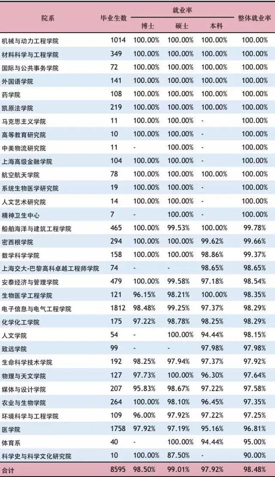 2017年上海交通大學本科、碩士和博士畢業(yè)生的就業(yè)率分別為97.92%、99.01%和98.50%。