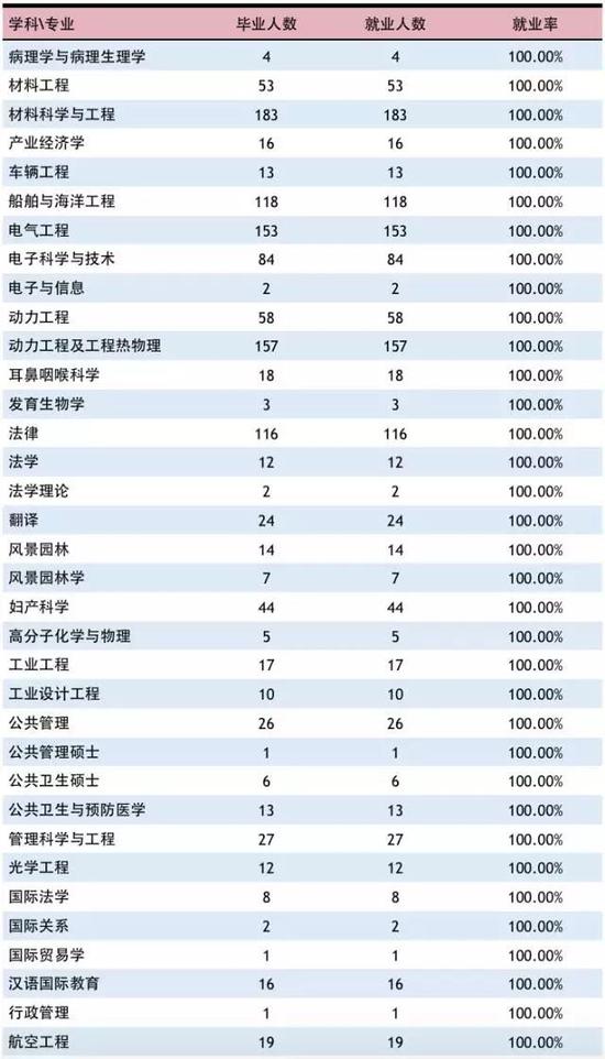 ![]() 從本科各專業(yè)來看,學校65個本科專業(yè)中,54 個專業(yè)的就業(yè)率達到了95% 以上,其中材料科學與工程、測控技術(shù)與儀器等36個專業(yè)的就業(yè)率達到了100% 。