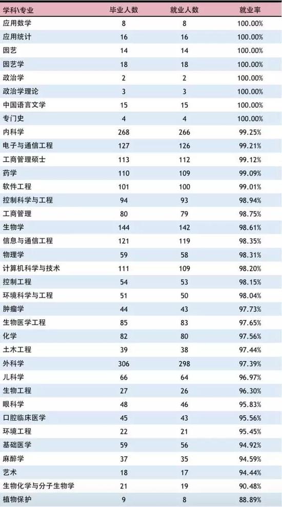 ![]() 從研究生各學科(專業(yè))來看,學校148個研究生學科(專業(yè))中,138個學科(專業(yè))的就業(yè)率達到95%以上,其中病理學與病理生理學、材料工程等115個研究生學科(專業(yè))的就業(yè)率達到了100% 。