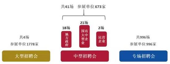 ![]() 2017年學校共計舉行1041場次各類招聘會,其中大型招聘會4場,國企集團、地方或行業(yè)類中型招聘會41場,小型招聘會996場(校級舉辦588場,院系承辦408場),共計到校招聘企業(yè)有3447家。