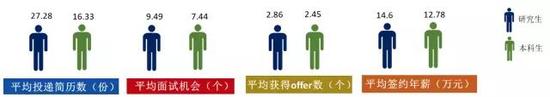 本科生在求職過程中平均投遞簡歷 16.33份,獲得 7.44個面試機會,獲得2.45份offer,平均歷時 2.51個月。研究生平均投遞簡歷 27.28 份,獲得9.49個面試機會,獲得 2.86份offer,平均歷時 2.82個月。