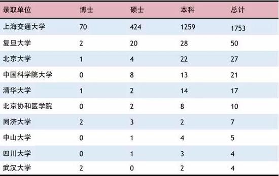 ![]() 除本校外,錄取上海交通大學畢業(yè)生人數(shù)排前三位的高校和科研院所分別是復旦大學(50 人)、北京大學(27 人)、中國科學院大學(21 人)。