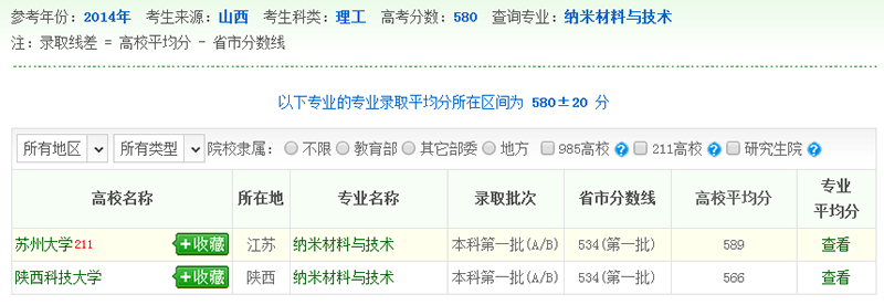 2014年部分高校納米材料與技術(shù)專業(yè)的錄取分?jǐn)?shù)