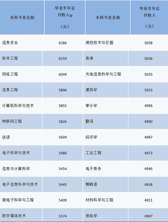 從統(tǒng)計(jì)數(shù)據(jù)來(lái)看,我國(guó)2017屆各專業(yè)畢業(yè)生半年后的平均月收入4774元,一般來(lái)說(shuō),文科類專業(yè)相對(duì)來(lái)說(shuō)要低一些,理工科的工資會(huì)稍微高一些。而且還統(tǒng)計(jì)了我國(guó)畢業(yè)半年后月收入最高的50個(gè)本科專業(yè)。其中排名最高的是信息安全專業(yè),達(dá)到了6386元,比全國(guó)平均收入高出了1612元,緊隨其后的是軟件工程和網(wǎng)絡(luò)工程專業(yè),這兩個(gè)專業(yè)的月收入分別是6259元和6049元,也都超過(guò)了6000元。此外,平均月收入超過(guò)5000元的共有26個(gè)專業(yè),這些專業(yè)主要集中在計(jì)算機(jī)、互聯(lián)網(wǎng)、工程類、信息類等專業(yè)中。