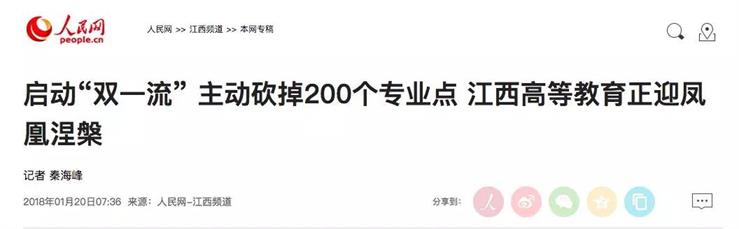 據(jù)人民網(wǎng)江西頻道今年1月報道,江西啟動了江西版高校“雙一流”建設(shè),并明確將投入40億元,重點建設(shè)有特色高水平大學(xué)和一流學(xué)科專業(yè)。此外,為了解決高校專業(yè)設(shè)置沒有與市場有效對接的問題,江西還大刀闊斧進(jìn)行改革,主動砍掉200多個專業(yè)點,江西高等教育正迎鳳凰涅槃。
